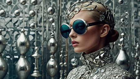 Elegant Model Showcasing Futuristic Fashion in Intricate Metallic Attire at an Art Installation.