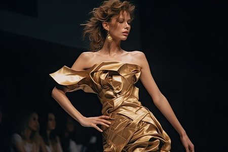 a woman in a gold dress on the catwalk runway at milan fashion week 2019 photo credit corbo