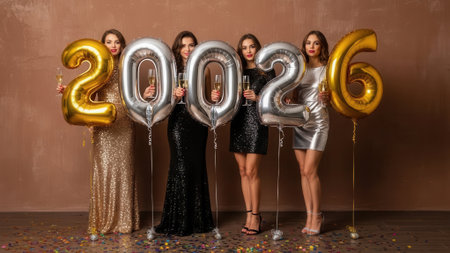 A group of five stylish young women in sparkling dresses hold gold and silver foil balloons forming the number 2026, celebrating the upcoming new year at a festive party.