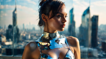 Futuristic Chrome back facing model adorned in reflective chrome lingerie posed against transparent futuristic cityscape