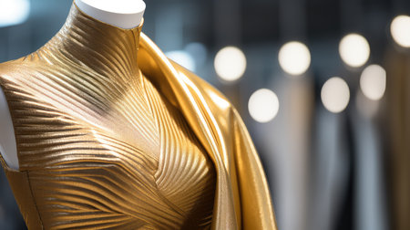 AI Generated. Reflective Gold Mannequin Displaying Modern Fashion Trends in Store
