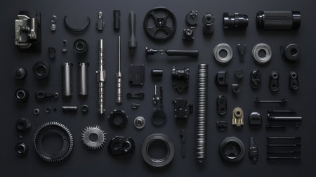 A captivating flat lay of industrial components showcases the beauty of design with an elegant arrangement of various pieces on a dark background.