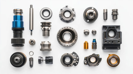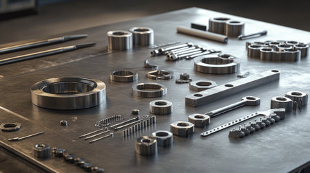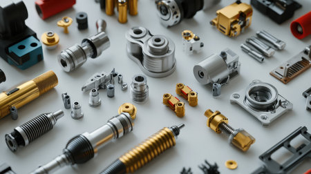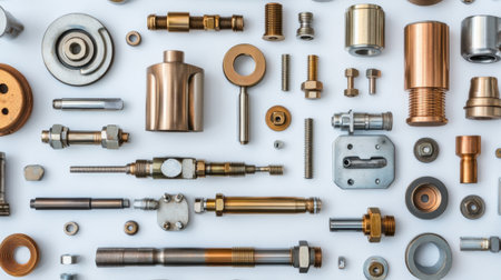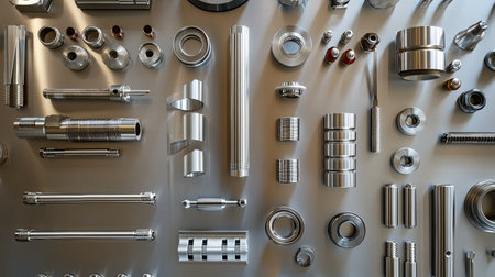 A visually striking collection of precision metal components and parts arranged methodically on a clean surface, ideal for industrial projects and designs.