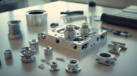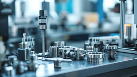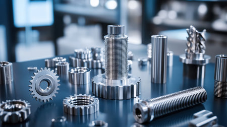 Explore a detailed view of precision metal parts in an industrial workshop, showcasing various components and tools essential for manufacturing processes.