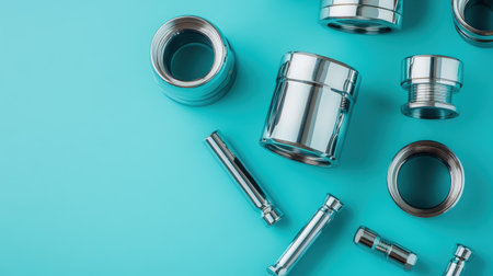 A collection of various chrome metal parts artistically arranged on a vibrant turquoise background, perfect for industrial, mechanical, or design projects.