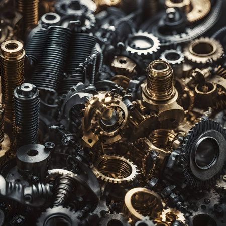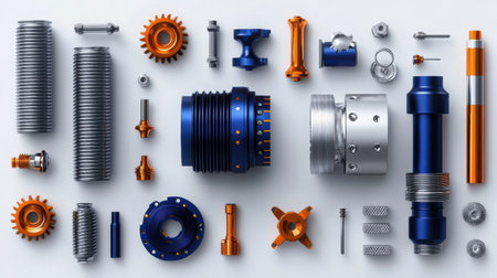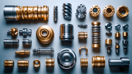 A captivating arrangement of various metallic components shows the intricate design and precision of modern engineering. Ideal for industrial themes.