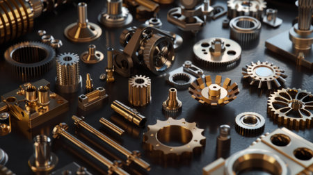 A detailed close-up showcasing an array of precision metallic parts arranged on a dark surface. The image highlights the intricate design and craftsmanship of various components.