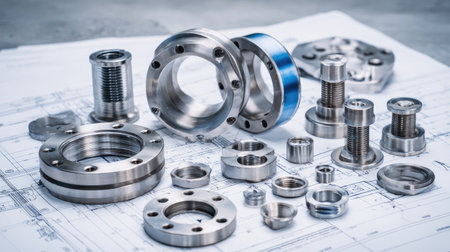 A collection of assorted metal components and machine parts arranged over engineering blueprints, showcasing intricate details for mechanical design and industrial manufacturing.