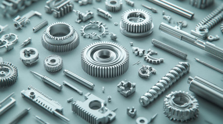 This image showcases a diverse arrangement of mechanical parts and components, featuring precision tools and designs used in engineering applications.