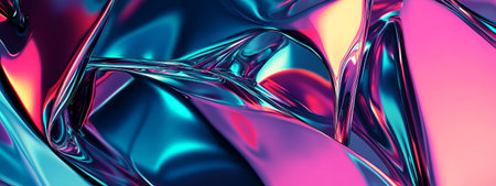 This piece showcases a vibrant interplay of textures and hues, merging the sleekness of metallic elements with the softness of matte tones. Ideal for digital design projects, website headers, and creative presentations where a modern, abstract aesthetic is desired. The high contrast and reflective qualities enhance visual impact, making it suitable for tech and design industries. AI-generated illustration.