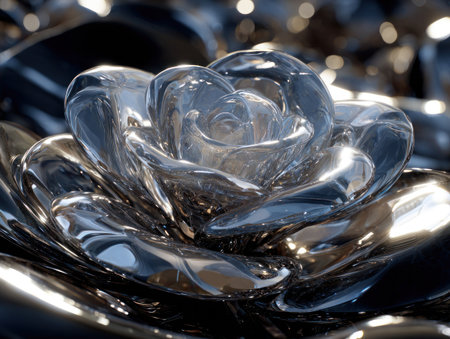 A close-up view presents a stylized metallic rose sculpture. The image showcases the reflective qualities of the metal, creating a glossy appearance. The lighting highlights the intricate details and curves of the petals. Suitable for various design projects, this image may be used for decorative or artistic purposes.