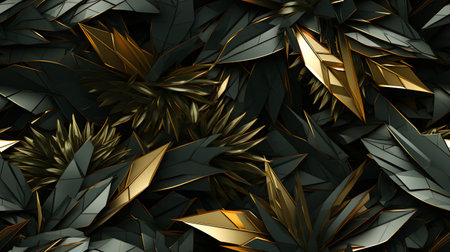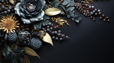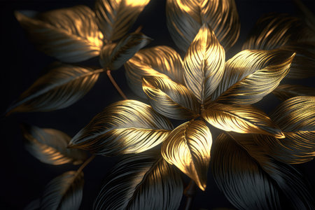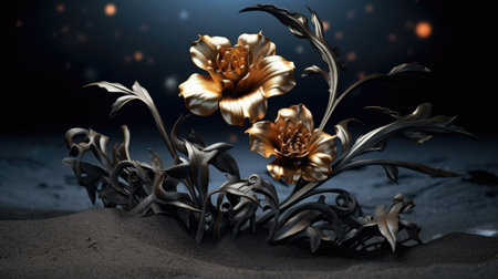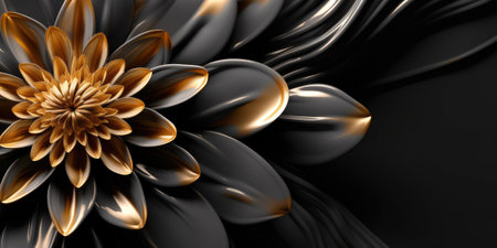 3d render of black and gold flowers with gold leaves on black background