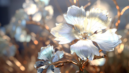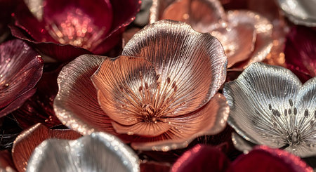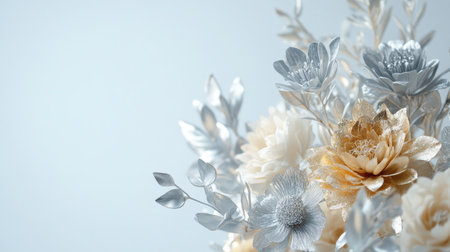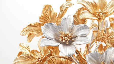 This stunning image features beautifully designed flowers with shiny silver and gold petals. The soft focus background enhances the elegance and charm, making it perfect for artistic and decorative use.