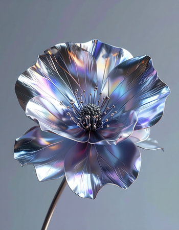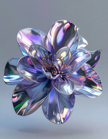 A stunning 3D rendered flower blooms with futuristic elegance. Its petals, crafted from iridescent metal, shimmer with a holographic spectrum of colors against a clean, minimalist background.