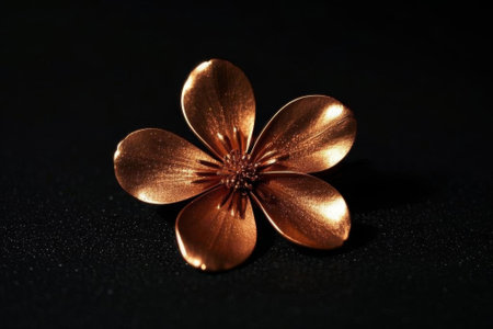 An artistic rendering presents a close-up view of an abstract floral form. The petals exhibit a metallic bronze sheen, contrasting against a deep black background. The composition features a central spiral, with light and shadow emphasizing the textures. This image could be suitable for various design projects and commercial applications.