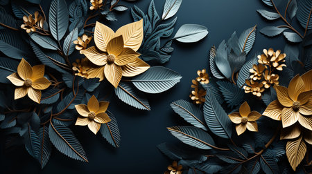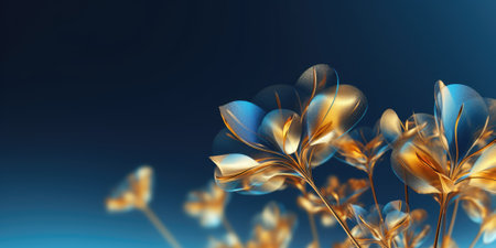 3d render, abstract floral background with gold and blue leaves.