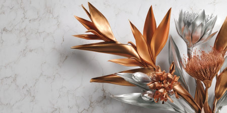 Colorful metallic flowers and leaves are creatively arranged on a smooth marble surface. The shiny textures create a modern and elegant look for decor.