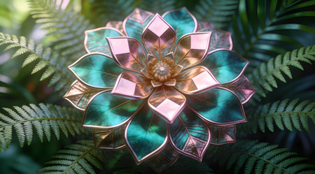 A close up image of a digitally rendered abstract design featuring teal and rose gold metallic crystal geometric shapes.