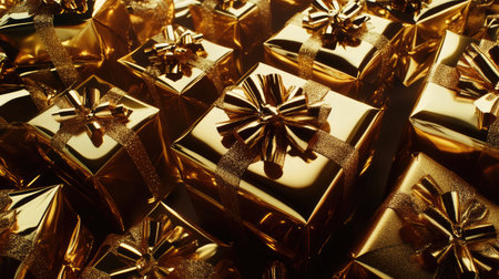 A stunning arrangement of golden gift boxes with elegant bows, perfect for festive celebrations, holidays, and special events. Ideal for seasonal decor.