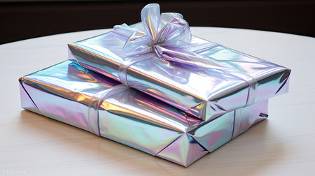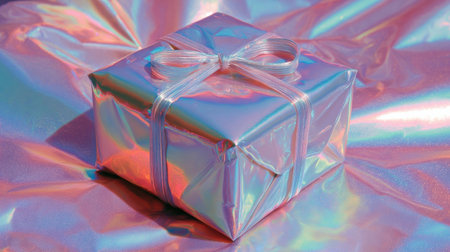 A beautifully wrapped gift box with a holographic finish sits on a reflective surface, showing vibrant colors and a delicate bow.