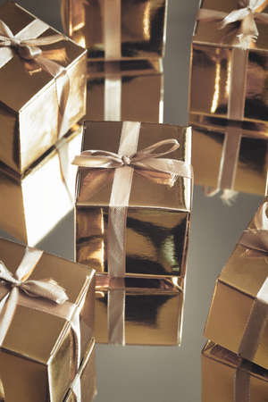 Group of gold sparkling gift boxes on grey background with reflection. A set of gold gift boxes for present, suprise,birthday,Christmas concept beauty