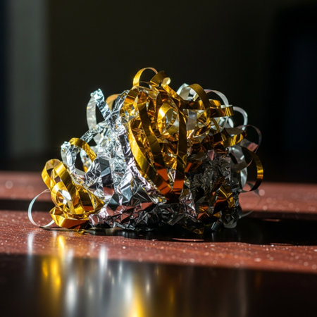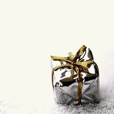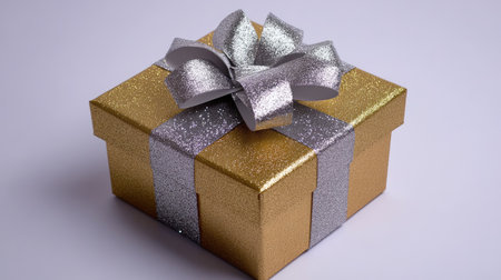 A shiny gold and silver ribbon is wrapped around a gift. The ribbon is decorated with glitter and has a shiny, festive appearance