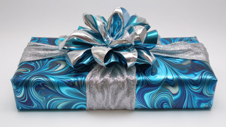 Beautifully wrapped gift box featuring a striking blue and silver design, topped with a large decorative bow, perfect for celebrations and special occasions.