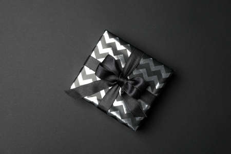 Gift box with bow on black background. Black Friday sale