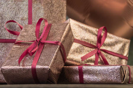 This image captures an elegant assortment of beautifully wrapped gift boxes in shiny materials, perfect for holiday celebrations and special occasions.