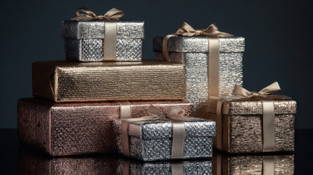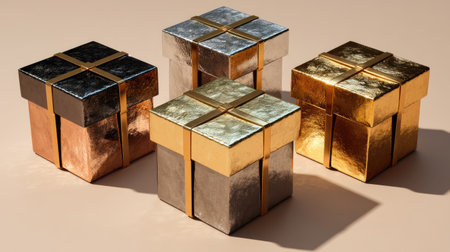 A striking arrangement of elegant gift boxes featuring luxurious metallic finishes such as gold, silver, and copper. Ideal for celebrations and decorative purposes.