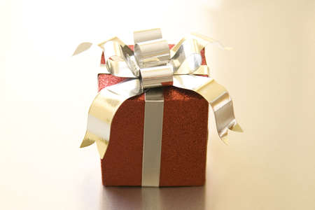 Giftbox in glittery paper with red bow on grey background holidays concept.