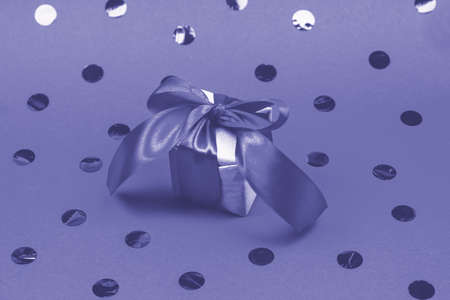 gift in wrapping paper on a red background Toned in color of the year 2022, very peri