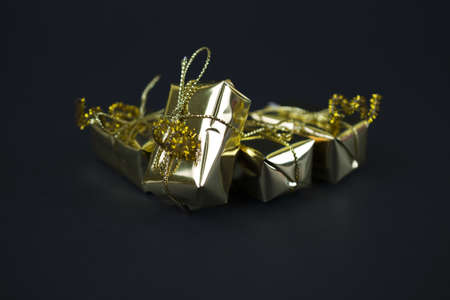 Christmas and New Year handmade wrapping gift boxes, golden ribbons, balls and baubles on the black background. Modern decoration in gold-black colors.