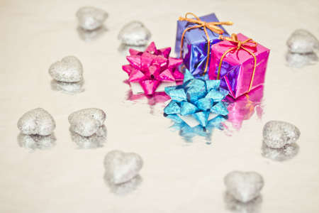 Gift silver boxes on a light table. colorful box of gifts.