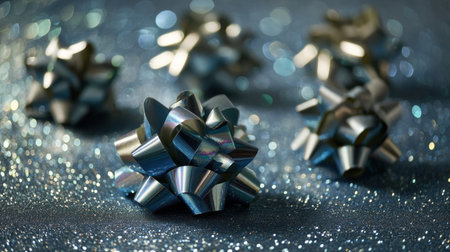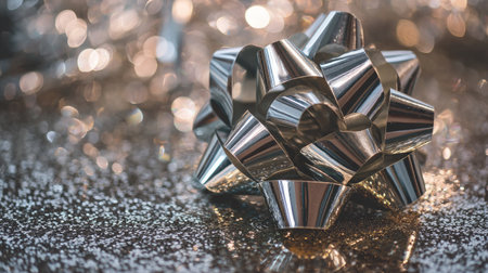 A close-up view of a silver gift bow on a shimmering glitter background, capturing the essence of festive decorations perfect for celebrations and special occasions.