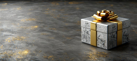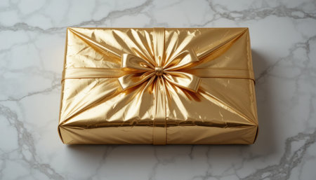 A stunning golden gift adorned with a shiny bow lies on a luxurious marble surface, evoking excitement and joy.