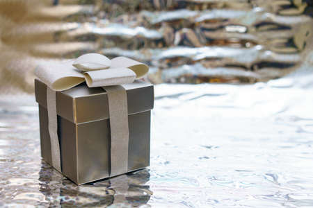 Silver gift box with silver ribbon and confetti on bokeh background