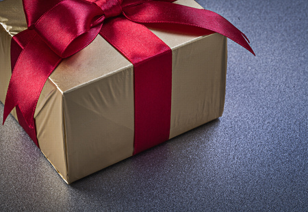 Gift box with gold bow on black fabric background, closeup