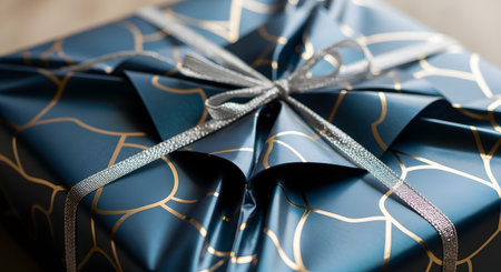 A close-up of a beautifully wrapped gift box, covered in dark blue paper with an elegant gold geometric pattern. The present is tied with a sparkling silver ribbon, which is fastened in a neat bow on top.