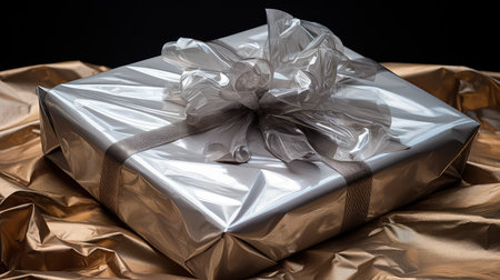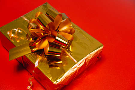 A gold wrapped gift box with a bow on top. The box is decorated with gold and silver and has a shiny appearance. Concept of luxury and celebration, as the gold wrapping