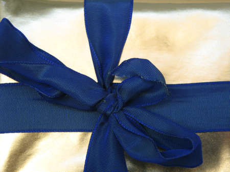 Blue bow ribbon on gift close-up