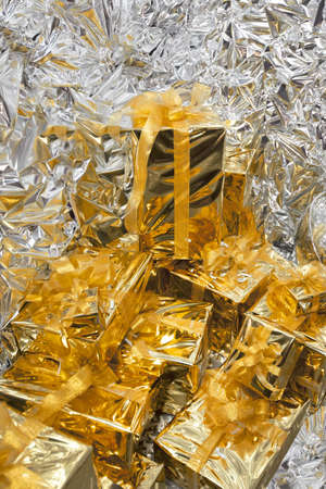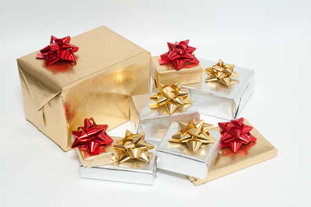 Gold coloured wrapped Christmas presents on a white background