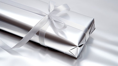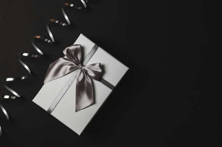 Square shape present wrapped in silver paper, decorated with silver shining bow on black background