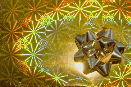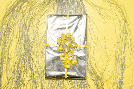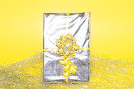 Christmas present wrapped in silver holographich foil with yellow ribbon bow on tinsel fringe and illuminating background
