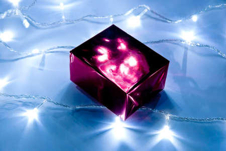 Red gift box and garland lights. Studio shot