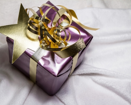Pretty gift wraped in purple and gold resting on soft white surface