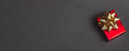 Beautiful gift red box with a gold bow on a black background close up, top view, copy space.Banner
