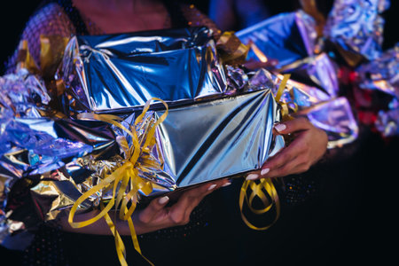 Award ceremony, contest winners receive prizes and presents on stage, guests and contestants gift package, gift giving at work, corporate gifts box, souvenirs and reward for company best employees