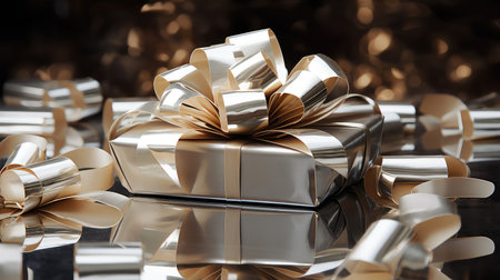 beautiful shiny gift box with bow on silver background