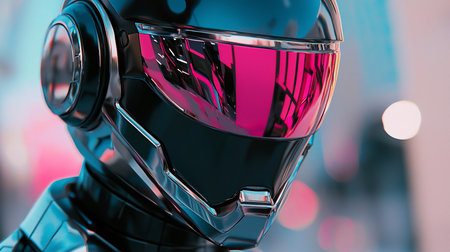 Close-up of a sleek, black futuristic helmet with a vibrant pink visor reflecting city lights. The chrome accents add a modern, high-tech feel against a blurred urban backdrop.